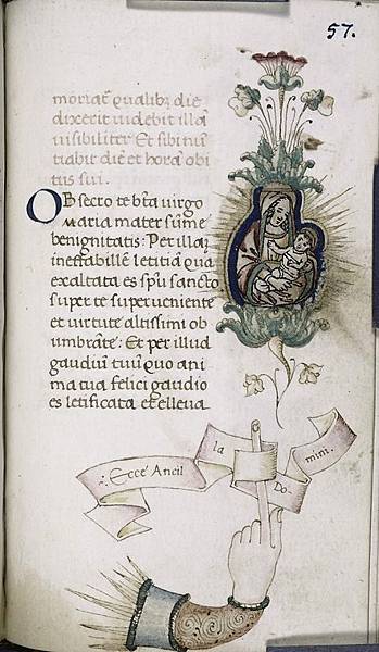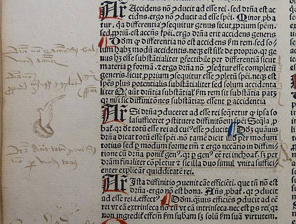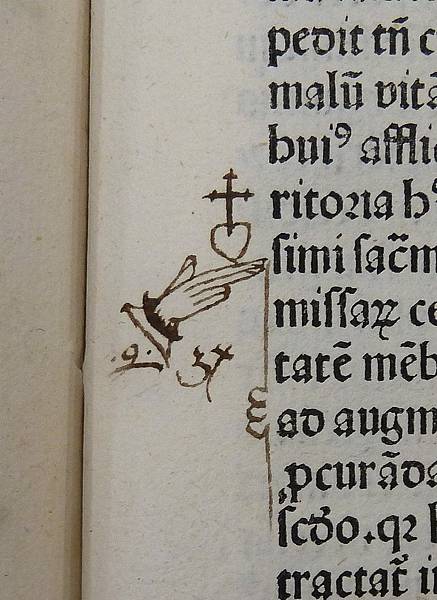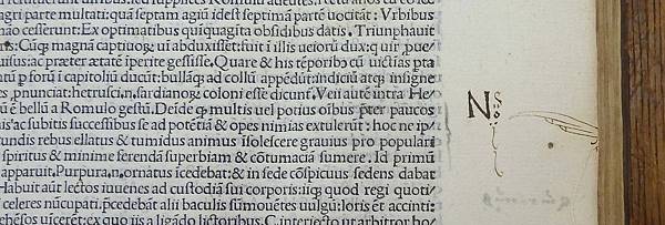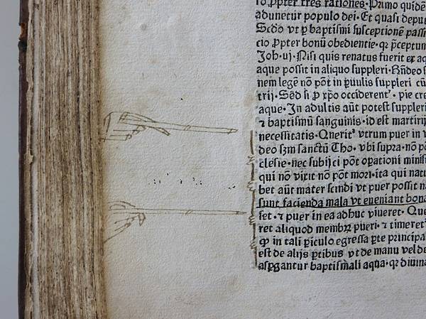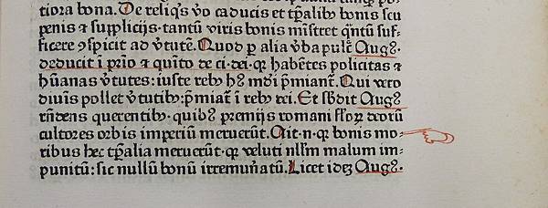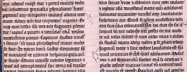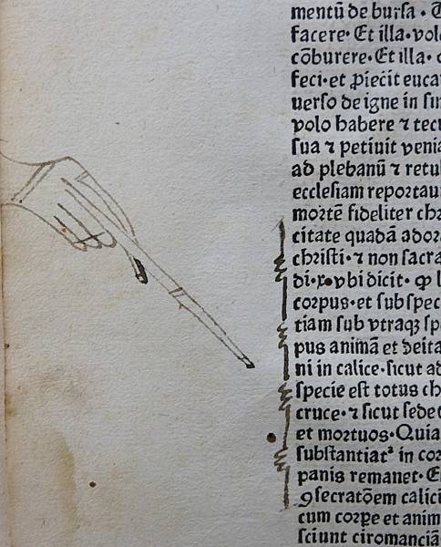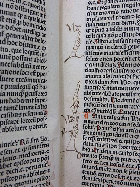 最後說一個有趣的小細節,臺大手稿倒數第二頁的左上方,第19節旁邊,赫然畫了一支比中指的小手(圖三)!根據資料,這個圖案應該是所謂的「manicule」,流行於歐洲中世紀與文藝復興時期,通常是為了標記出文章中重要的字句。猜猜看指出的是哪段文字?(答案就在圖三中。)