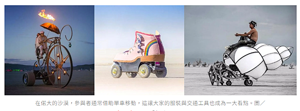 在偌大的沙漠,參與者通常借助單車移動,這讓大家的服裝與交通工具也成為一大看點。圖/burningman@Instagram