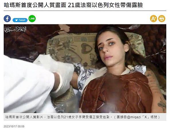 哈瑪斯首度公開人質畫面 21歲法裔以色列女性帶傷露臉 - 國際 - 自由時報電子報