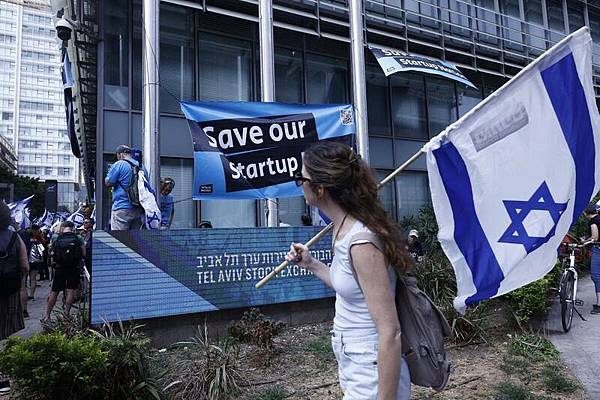 以色列總理納坦雅胡的司法改革,引發示威抗議,在今年7月的1場示威中,路邊標語寫著「拯救我們的新創國度」。