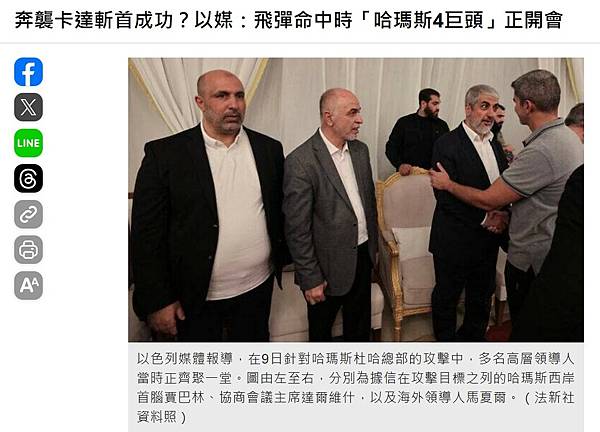 "奔襲卡達斬首成功?以媒:飛彈命中時「哈瑪斯4巨頭」正開會 - 國際 - 自由時報電子報" https://news.ltn.com.tw/news/world/breakingnews/5172738