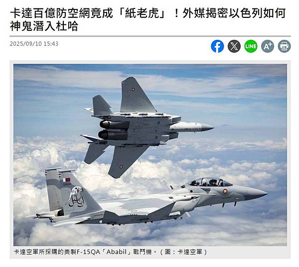 : 以色列強大的電戰與網戰能力,可能在攻擊前,就已透過精準的網路入侵或電子干擾,癱瘓或「致盲」了卡達的雷達與指管系統。