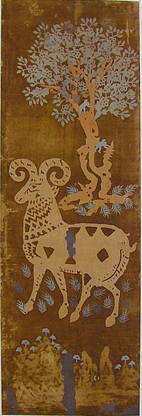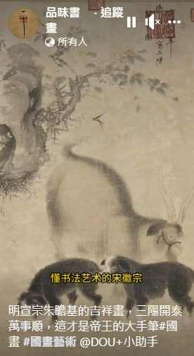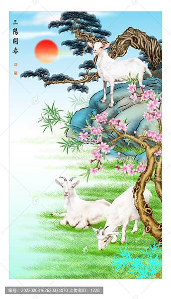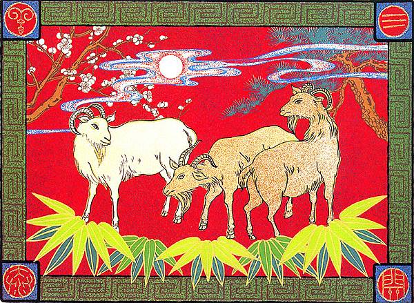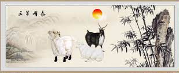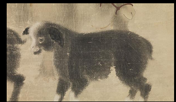 明宣宗(西元一三九九─一四三五年)朱瞻基,書畫之作隨意自然,往往與宋徽宗(西元一0八二─一一三五年)爭勝。本幅作於宣德四年(西元一四二九年),淺設色畫子母山羊一大二小,襯以竹、石、茶花,以諧音取「三陽開泰」之意。「三陽開泰」典出《易經》﹞六十四卦的第十一卦「地天泰」,卦象乾下坤上,以寓天地上下交通同泰。十二個月中以泰卦居於正月,取其冬去春來,陰消陽長的吉亨之象。