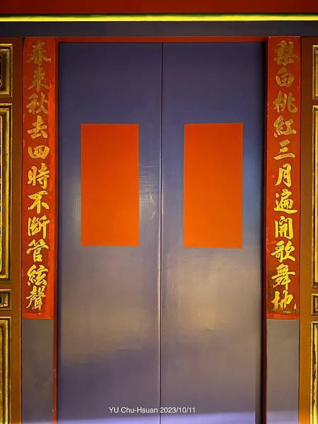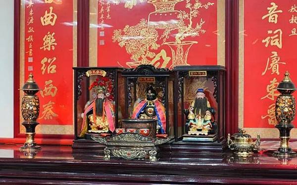 但不論是哪個派別館閣,南北管有共同信仰的三尊戲曲之神:田都元帥(演戲的祖師爺)、孟府郎君(南管的祖師爺)、西秦王爺(北管的祖師爺)。在南北管音樂戲曲館內自然也有供奉祂們,而為了讓一般民眾也能認識這三位戲曲的祖祖師爺,展示廳裡則設置有未開光的神像從欣賞典藏文物與表演入門來到展示廳,還有許多典藏文物可以欣賞,包括入口上方的「八仙彩」都藏著許多細節,除了有吉祥寓意的喜鵲、鶴、牡丹、蝴蝶等圖樣,來表現刺繡傳統藝術與喜氣臨門的意涵,還可以看到左右童子分別持著琵琶和洞簫,把南北管音樂戲曲館的一些元素也繡上去了。門口立在地上的子弟鑼是採用來自宜蘭銅鑼製造老字號的林午銅鑼,其尺寸與厚薄經過老師傅精密的測量呈現出最美好的樣態。在北管演出開始前,會先敲三下鑼,表示通知觀眾表演要開始了,其渾厚的聲音具有包容又震撼的效果。展示廳裡實際展出南北管的各種樂器,仔細看會發現北管大多使用金屬類的絃線,南管則以絲線、棉線為多,形成兩者演奏起來的音色差異。此外,也有典藏戲服、彩旗、木雕鼓架等物件,以及包括樂曲種類、記譜方法等更深入的介紹。