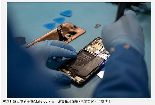 專家拆解華為新手機Mate 60 Pro,證實晶片採用7奈米製程。(彭博)