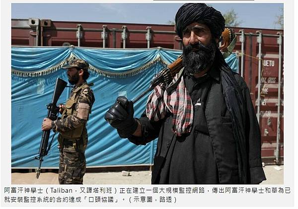 華為遭控涉及協助中共監控的黑料,吸引阿富汗神學士上門談合作,《路透》近日披露,阿富汗內政部發言人卡尼(Abdul Mateen Qani)透露,阿富汗神學士政權建立大規模監控網路是為恢復安全和打擊「伊斯蘭國」,當局已與中國華為針對潛在合作進行討論。華為則回應雙方會議期間「沒有討論任何計畫」。