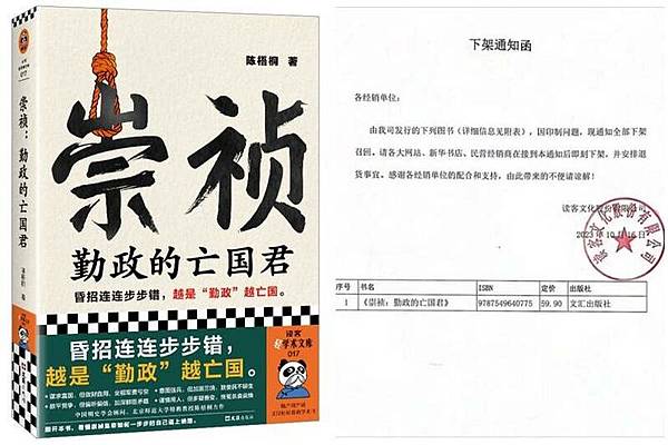 中國一本9月出版的新書《崇禎:勤政的亡國君》今天遭下架。網傳的通知書顯示,「因印刷問題」停售此書;但書封宣傳語「昏招連連步步錯,越是『勤政』越亡國」則讓人與當前政局產生聯想。