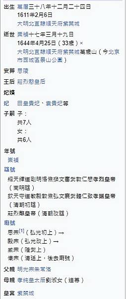 明思宗朱由檢(1611年2月6日—1644年4月25日),字德約[2],明朝第17任皇帝,亦是清朝入關前最後一任明朝皇帝,年號「崇禎」。 崇禎帝 - 維基百科,自由的百科全書