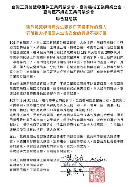 譴責李鴻源詆毀口罩國家隊 3大公會聯合要求道歉