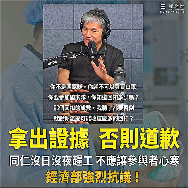 針對李鴻源稱口罩國家隊賺取回扣一說,經濟部要求李拿出確鑿證據,否則應為該番言論公開道歉。(圖取自經濟部臉書)