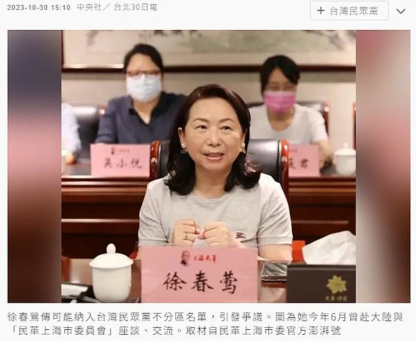 台灣民眾黨不分區立委名單傳可能納入中籍配偶徐春鶯。民進黨立法院黨團副幹事長蔡適應今天受訪質疑,民眾黨若要將此爭議人物列入不分區,其實不是民眾黨的代表,而是中國派在台灣的代表。被爆曾是中共幹部!傳民眾黨不分區納陸配徐春鶯 綠營批:非常荒謬 | 2024立委爭奪戰 | 要聞 | 聯合新聞網 https://bit.ly/3FC5YBo