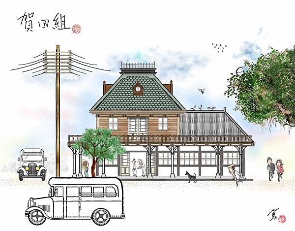 從舊照看,賀田組的這棟辦公室蓋得很像台北市撫台街那棟「高石組」的石頭屋,同樣都有厚重的曼薩式屋頂、銅製魚鱗瓦,但屋身經研判為木材,座落在三角窗,主樓兩旁還有沿著道路展開的兩翼。綜合陸續畫出來的舊站重要建築,到日治末期,站前廣場應如下圖:
