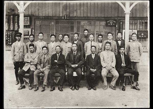 朝日組門前合影。前排正中央為古賀朝一郎,後排身高最高者為林桂興