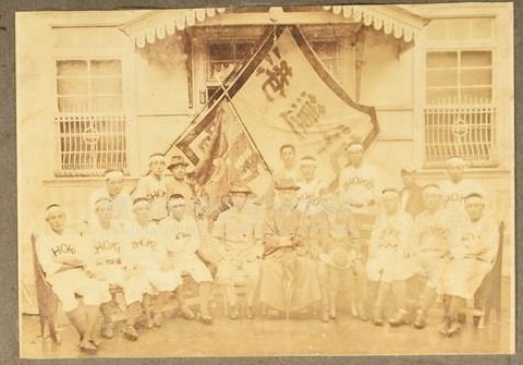 這是商工團成員在台灣商工銀行花蓮港支店前的合照,中央雙手叉腰者為梅野清太,他是商工銀行監事,左邊是古賀朝一郎。球員在花蓮港大旗幟合照,球衣繡有"SHOKO"
