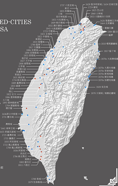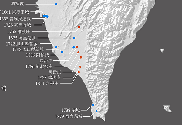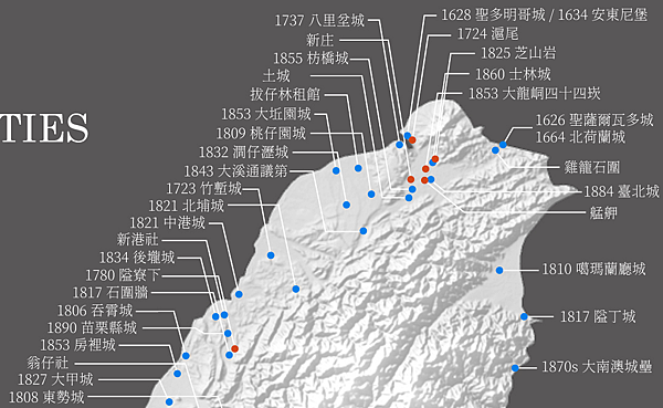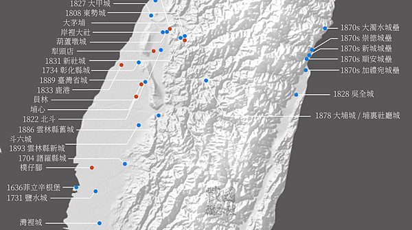 下圖是西元1600-1900年間在台灣所建的要塞城郭。圖中藍點是城,多半位於貿易發達的大型聚落,這些地方商人豪強有財力建造防禦力高的要塞,例如枋橋城、阿里港城、阿猴城、大甲城、房裡城等等。除此之外還有荷西明清駐台人員興建的堡壘和府縣城