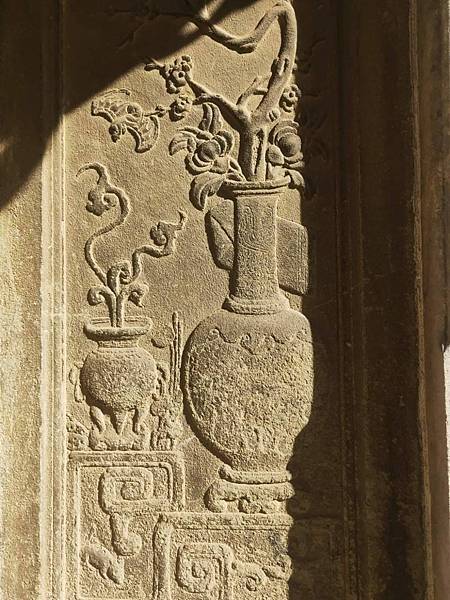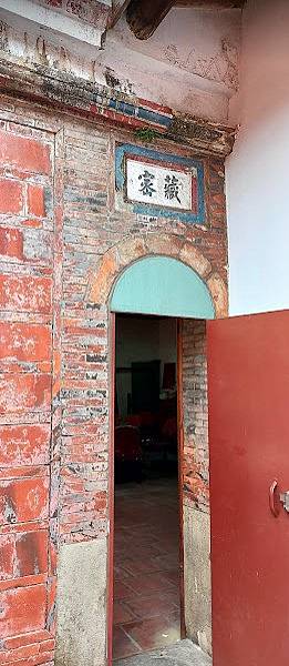 新竹市國定古蹟「進士第」修復工程29日完工揭牌,後天井門上刻有「一團和氣」,門旁兩邊牆壁以清水磚砌成卍字且連續不斷。(王惠慧攝)