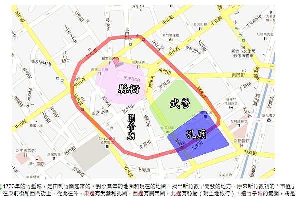 昔日新竹城出北門, 由:北門城>水田尾「進士第(二級古蹟)>「鄭氏家廟(三級古蹟)>「湳雅」>穿過「竹巷」>進入「舊社廟仔」> 紅瓦厝渡>新社渡>新社,經鳳山崎,北上台北。