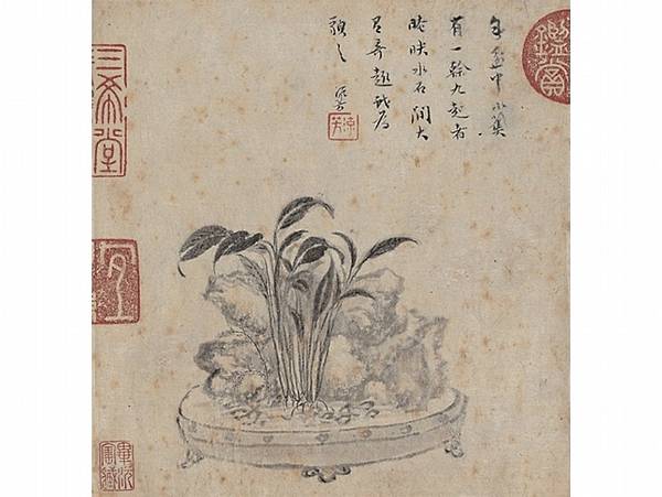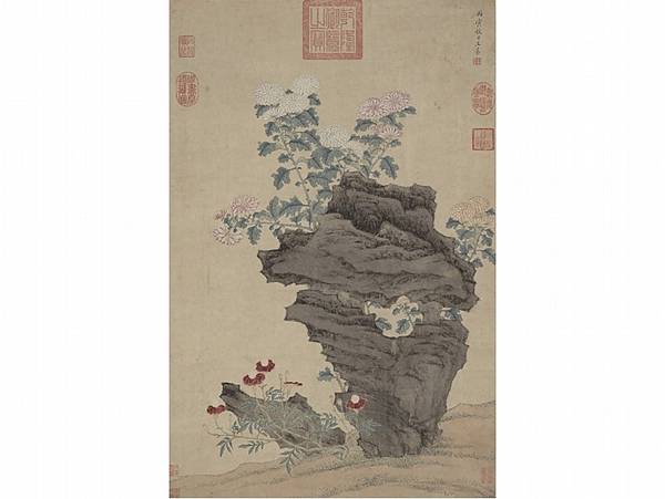 王綦清雅的風格不限於山水。此作以菊花奇石為題,設色雅澹又不乏細節,應可說是《長物志》提到九、十月應懸掛應景菊石圖的圖解吧!此外,畫中下方細節畢現的紅色花卉,有可能是明末新傳入的「萬壽菊」。(註2)
