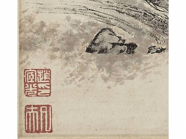 明張宏〈寒山高逸〉軸下方「趙宧光印」、「凡夫」兩印,顯示此作曾為趙宧光收藏。(國立故宮博物院提供)