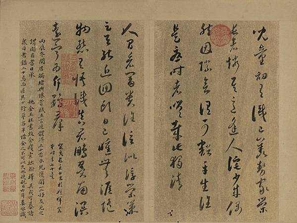 《長物志》卷九「舟車」的審定者婁堅(1567~1631),字子柔,嘉定人。此冊為1616年婁堅應友人之請,在金牋紙上以不同書體抄錄自己的20首詩作,可見其對蘇米書風的臨習。值得注意的是其書風亦與同時代董其昌的風格接近,散發閒適超逸的格調。董其昌並非蘇州人,然為引領當時藝文風氣的松江後起之秀。文震亨《長物志》推薦讀者董其昌的書法作品,可看出當時董字已備受肯定,蔚為時尚。婁堅此冊所使用的金牋,其上有明顯刷染痕跡,是比較特別的金牋種類,也可見當時文人對書寫材料的講究。