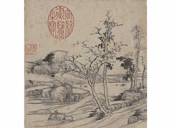 明李流芳《山水寫生冊》第三開〈坡石秋林〉。(國立故宮博物院提供)