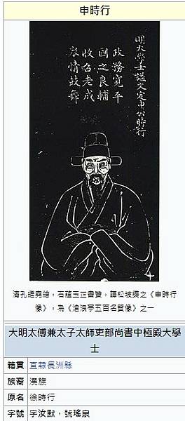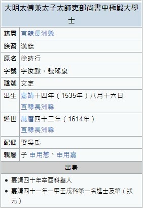 明世宗嘉靖十四年(1535年),申時行出生於蘇州一户普通人家。他的祖父從小過繼于徐姓舅家,故時行幼時姓徐,中狀元后歸宗姓申。 [18] 嘉靖四十一年(1562年),以第一名進士及第,官授翰林院修撰。歷任左庶子、少詹事兼侍讀學士、詹事兼侍讀學士。萬曆三年(1575年)官至禮部右侍郎兼侍讀學士加太子賓客。萬曆五年(1577年)轉吏部右侍郎,次年轉左侍郎兼東閣大學士,入閣參政。萬曆七年(1579年)進禮部尚書兼文淵閣大學士。萬曆十年(1582年)六月晉太子太保,九月再晉少傅,次年加兼太子太傅、吏部尚書、建極殿大學士。萬曆十二年(1584年)升少師、太子太師、中極殿大學士,位居首輔。後因建儲事為言官所劾,罷歸,萬曆四十二年(1614年),申時行卒,年八十。贈光祿大夫、左柱國、少師兼太師、吏部尚書、中極殿大學士,贈太師,諡文定。 [19]
