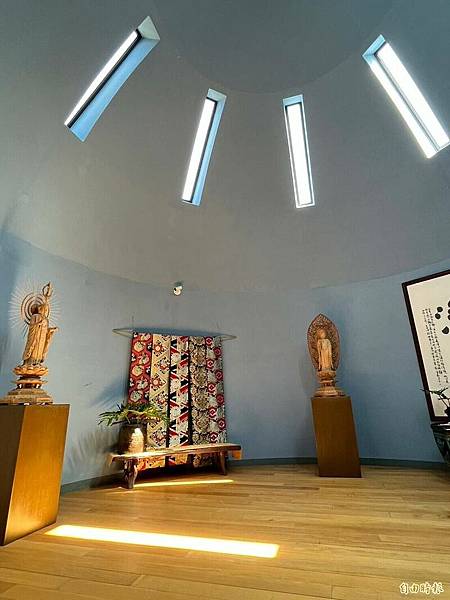 這棟綠建築物以自然採光為主,無空調,挑高三樓半,讓人仿佛置身在洞窟內,感受寧靜又莊嚴的時刻。記者郭政芬/攝影