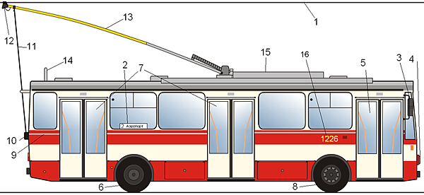 無軌電車的車身和底盤一般與普通公車相同,但車頂需要安裝一對集電桿,用於從電車線的一對電車線受電並形成電流通路。一般地,無軌電車的集電桿脫線則會失去動力;而裝備有動力蓄電池、超級電容器或柴油發電機的雙動源無軌電車,則可在沒有高架電車線的路段實現離線行走。[參4]