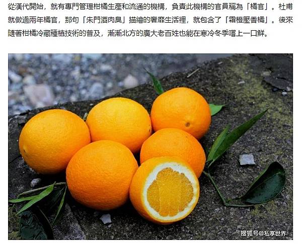 從漢代開始,就有專門管理柑橘生產和流通的機構,負責此機構的官員稱為「橘官」。杜甫就做過兩年橘官,那句「朱門酒肉臭」描繪的奢靡生活裡,就包含了「霜橙壓香橘」。後來隨著柑橘冷藏種植技術的普及,漸漸北方的廣大老百姓也能在寒冷冬季嚐上一口鮮