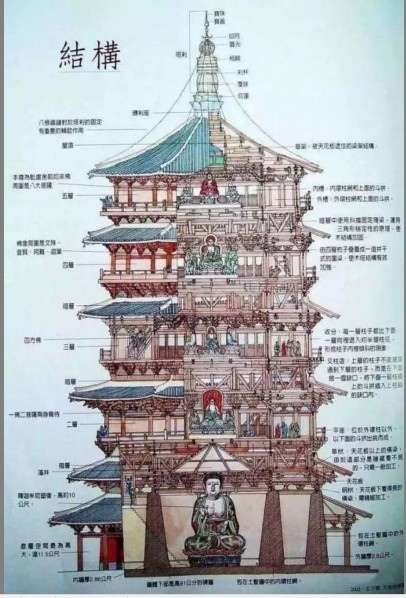 應縣木塔全塔皆以木構與斗栱結合而成,未用一根鐵釘,設計精巧冠絕古今。圖為應縣木塔結構圖。(圖/新浪網)