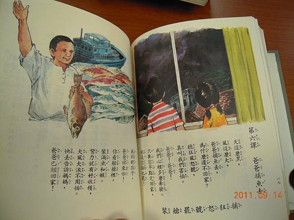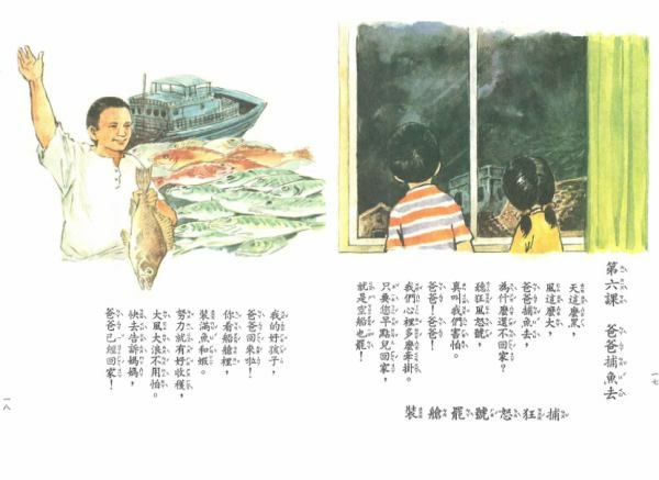 最經典的應該是那一篇課文吧,天那麼黑、風那麼大,爸爸補魚去怎麼還沒有回家,以前總是會改編課文來玩,有好幾個版本,先不管什麼意識形態還有政治因素,這些課本還真的挺有趣,內容淺顯又易懂,搭配那個好像有點憨憨的圖片,真是合適。那時都會想到底誰的爸爸一天到晚都在捕魚,還捕到天黑還沒有回家,真的很辛苦耶,結果下一刻爸爸馬上就回來了,船艙還裝滿了魚和蝦,真的是努力就會成功啊,好感動。
