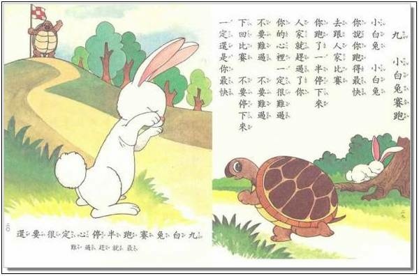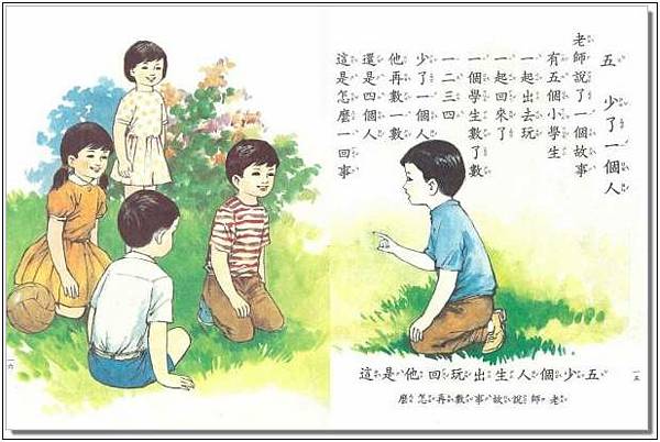 還有什麼拔蘿蔔或是玩皮球,總歸來講其實還蠻生活化的說,要不然坐火車過山洞,要不然就是跟爸爸媽媽有關係,或提倡一些好觀念,對長輩家人師長都有禮貌。有一篇課文還真的很有梗,有五個小朋友出去玩,玩完之後回來,結果怎麼數都是四個人,那第五個人呢,他消失不見了好可怕啊,不管他怎麼數都是四個人,其實他忘了數自己,難怪圖裡面的小朋友都笑得好淫蕩,一定再笑你這個小笨蛋,你少算自己了啊。