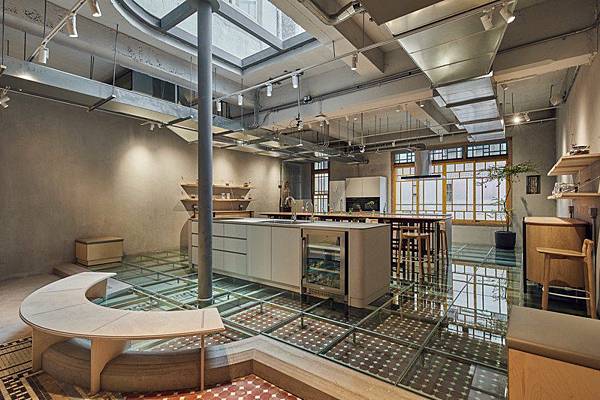 或者新州屋三樓共創廚房「或者新州屋」三樓使用金屬結構和玻璃板架高地面,凸顯原有地磚的特色與使用痕跡(圖片提供:或者新州屋)