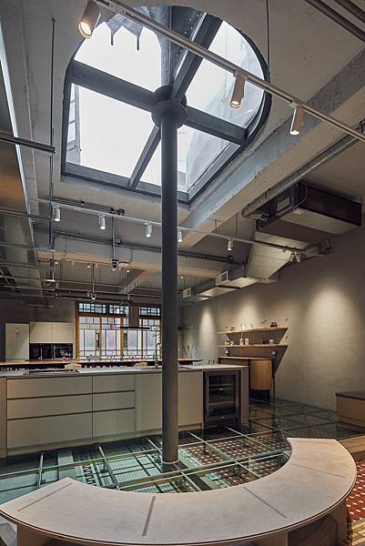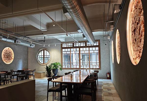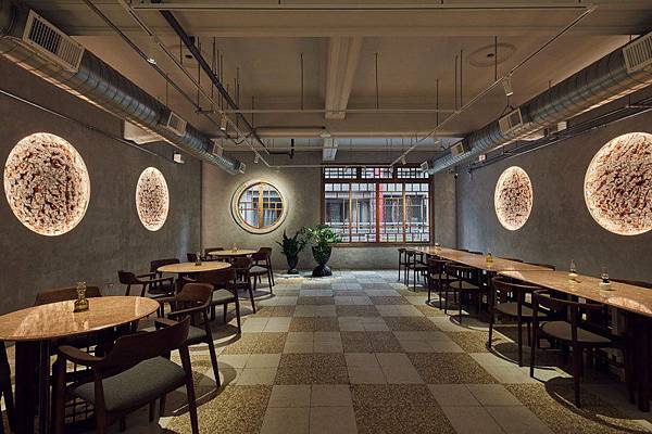 【二樓的方窗和圓窗用光影帶出時間感】,盡量留下原先的建築特色,桌角以舊窗為基底,加上西班牙紅的大理石桌面和地板鋪面。在靠近廚房處,可以看到致敬"鹽田千春"inside and outside柏林圍牆和菱形S家徽為中心做出的設計,戴家後人看到都相當感動。後方則是當年的員工內部通道。在二樓的內側可以看到清朝和民國後的房子,都是當代相當好的建物。