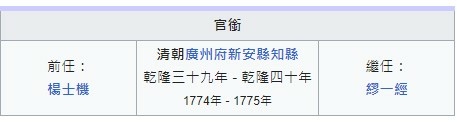 乾隆三十九年(1774年),擔任清朝廣州府新安縣知縣[1]。後由繆一經接任[2]。