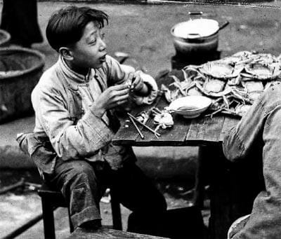 這張照片是美國大兵 Walter Arrufat 1945年在上海拍攝的,照片被解讀成「貧童大啃當時沒什麼人想吃的大閘蟹」,讓人有時人暴殄天物之慨。但這應該不是事實。