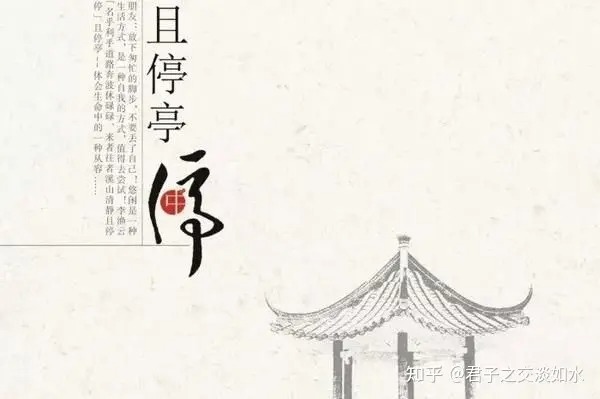 清代著名的戲曲家李漁在他的家鄉修建了一座亭子,名曰:且停亭,並在亭子上撰寫了一副對聯,名乎利乎道路奔波休碌,來者往者溪山清靜且停亭。他的意思是告訴來來往往的人們,在名利奔波的路上,到了這溪山清靜的亭子,不妨停下你的腳步休息一會兒。其實人生的路上有許多這樣的亭子,你可以坐下來喝杯茶,大家說說笑話,講講故事,也可以領略周圍美麗山水,也可以低頭沉思或閉目養神,真正體會人生的一種從容。
