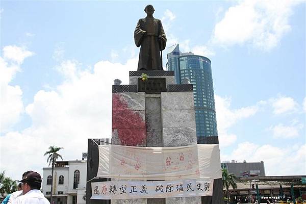 台南市長榮大學、成功大學數名教師,今天向台南火車站前圓環的鄭成功銅像潑紅墨水,指稱鄭成功是屠殺原住民的凶手,並要求民進黨政府提出落實原住民族轉型正義方案。