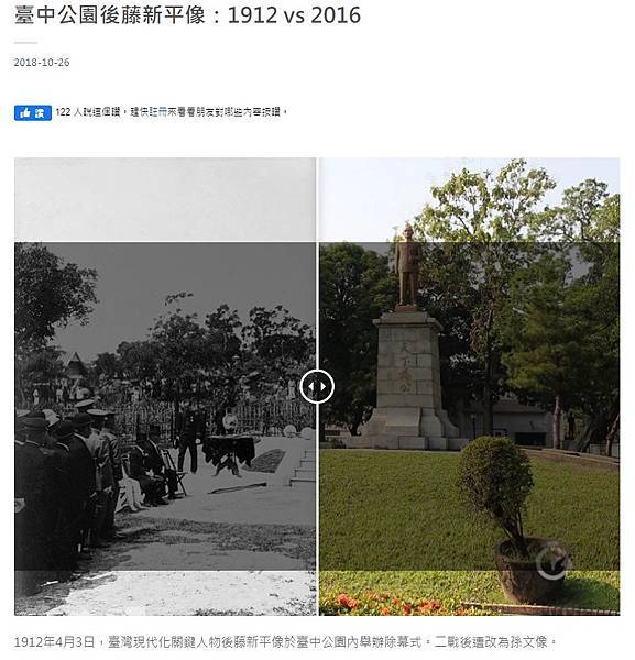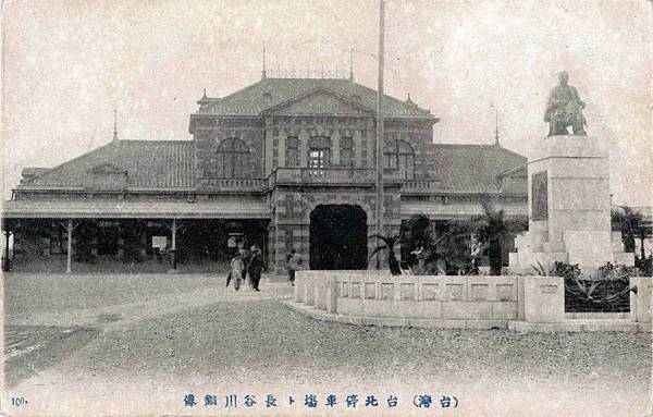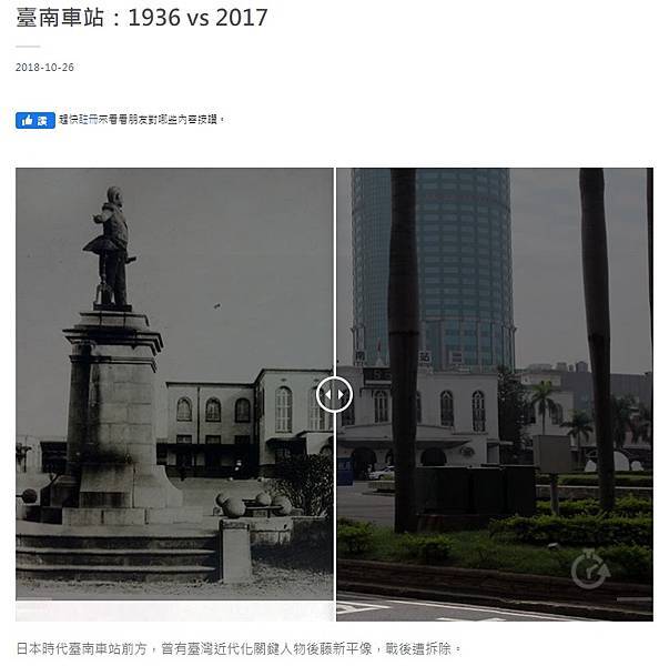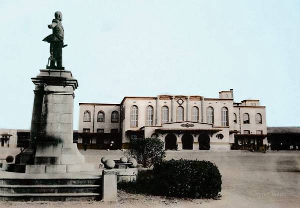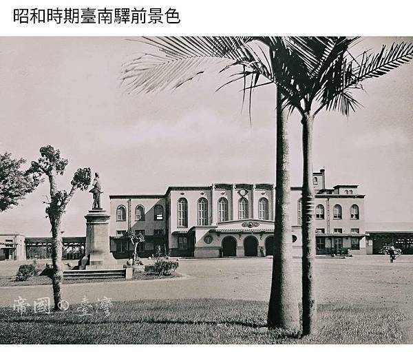 圖為約1936(昭和11)年之臺南車站影像(原圖黑白+數位上色)與1912年初設置的臺灣近代化關鍵人物後藤新平像