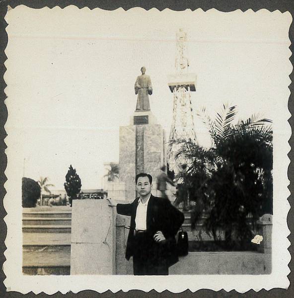 本照片的主角張清全在臺南火車站圓環的鄭成功銅像及「臺南鐵塔」前留影,做為臺南之行的註記。