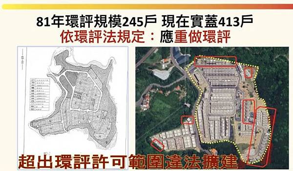 陳椒華質疑,新竹縣政府未進行環評變更就違法發建照,建商寶君建設未依環評書內容違法開發,包括基地北邊和東邊邊坡多棟建物,由於太靠近邊坡,數十棟建築屬於具有高風險建物,而且是違法擴建,應依法拆除。