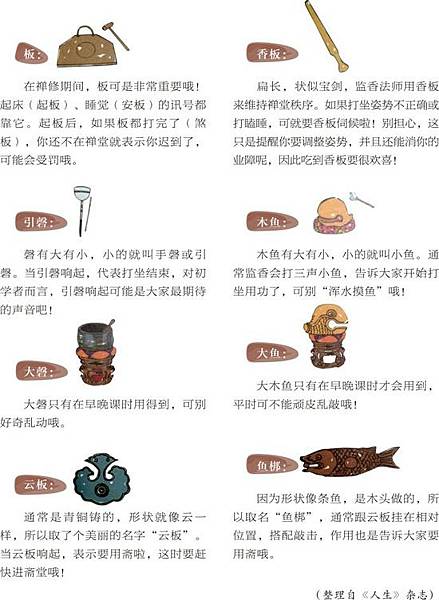 從堂內和堂外用的這些法器,我們可以看到祖師製定的這些規矩,每個叢林至今仍在使用,除了我們剛才說的起香、跑香、聽開示、止靜、抽解,乃至堂內發出的訊號,我們都應準確掌握,至於一板一鐘,兩板一鐘,三板一鐘的敲法,我想各位都是引禮師就不用多說了,自然是熟稔於心。
