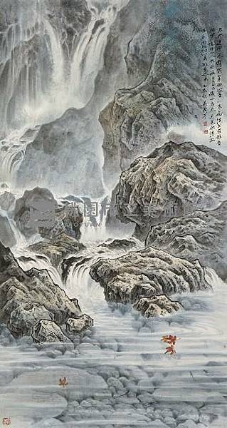此畫構圖嚴謹,近景清潭見底,中景流瀑湍急,遠景水氣氤氳,泉瀑以S形自岩石間層層流瀉而下,充滿律動感,若可聞瀑布流水之樂。在畫面虛、實的處理上,作者以左下至右上之對角線為界,對角線右側近、中景岩石用濃墨勾出粗獷的輪廓線,以小斧劈皴表現嶙峋質感與豐富的層次肌理,表面淡染赭色與花青來處理光影變化,營造立體感,山頭綴以范寬風格的點點密林,多所援引宋人筆墨。對角線左側層層岩壁則用淡墨與花青渲染,詩意縹緲,與右側岩石粗獷的堅實感形成虛實與剛柔對比。潭水清澈見底的透明感與寫實的光影處理則充滿現代感,融會古今的手法相當巧妙。作者款識則明顯流露出近現代書畫巨擘張大千(1899-1983)的書風。