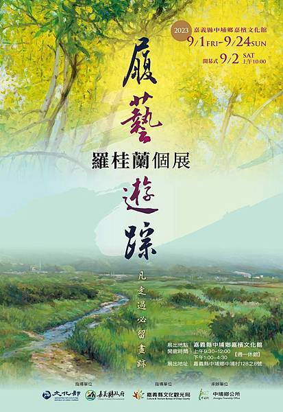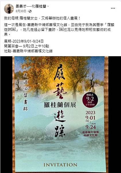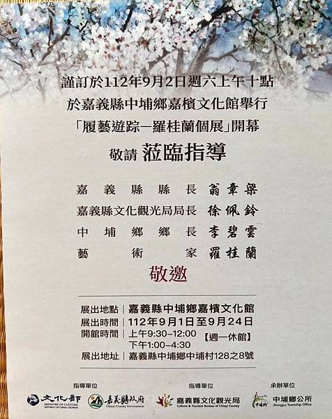 這一次是展在-嘉義縣中埔鄉嘉檳文化館,並由兒子我為其題字「履藝遊踪」,她凡走過必留下畫跡,也足以見得她耕耘在藝術的成果。