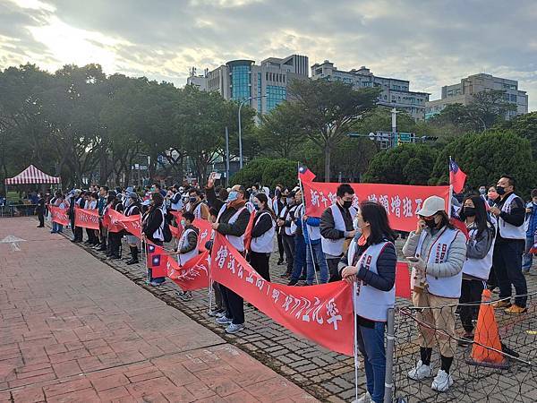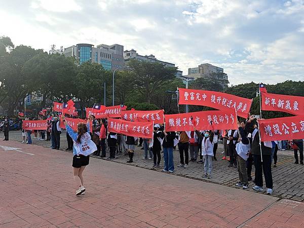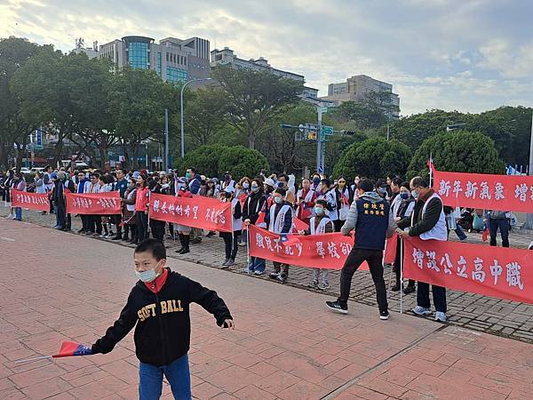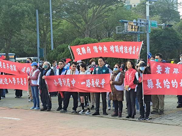 新竹縣元旦升旗一早在新竹縣政府廣場舉行,廣場後方百位家長舉著紅布條向新竹縣長楊文科陳情,呼籲縣府超前部署,今年起就要增額。楊文科在台上致詞時回應,感謝鄉親今天拿紅布條希望中央要增班、重視這問題,中央權責必須要增班幫助新竹縣,但目前都得不到中央具體承諾,我們會繼續努力。