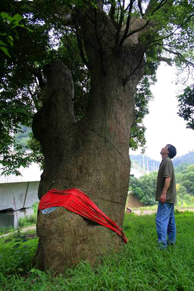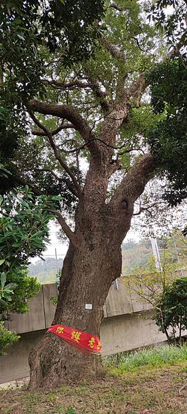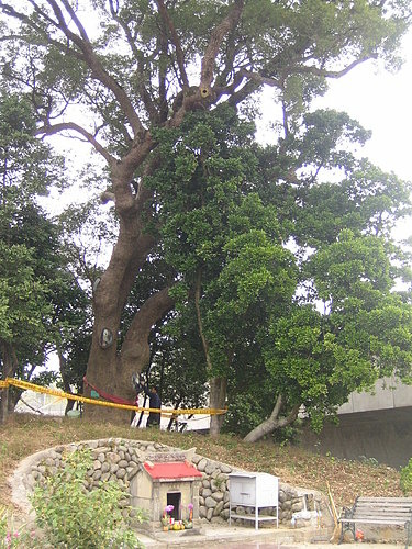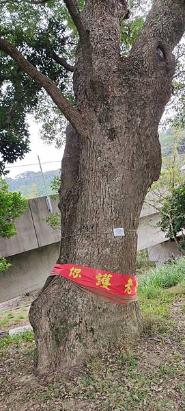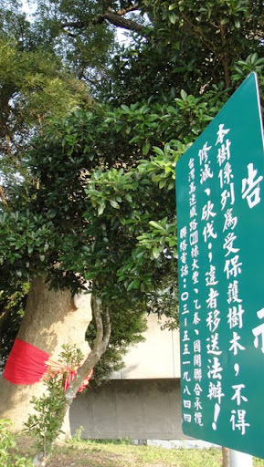 當初高鐵規劃路線時,本來要將這棵新竹市最老的樹砍除。後來由學者發起,加上當地民眾的體認,展開搶救行動,也順利獲得當時高鐵董事長殷琪的支持,於是路線往東偏了一些,老樹才有機會繼續活下去。因為這一個小彎,高鐵花了6000萬重新規劃路線,但我想這6000萬花得有價值,畢竟6000萬也沒辦法馬上長出一棵300年老樹。而老樹上的紅布條則是當地居民所繫上的,象徵抗議、保護、崇敬之意。