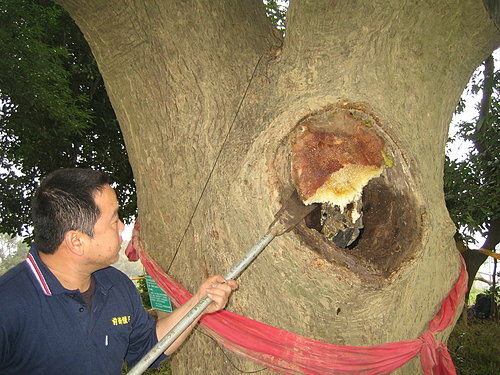 這棵伯公級的老樟樹得到的是「腐朽病」,不會馬上要命,我們的樹醫說,這種病無法根治,只能減緩它受腐蝕的速度,還有不要讓它有公共危險上的疑慮。目前樹軀一步一步地被腐蝕,樹幹已成大空心。幾年前已有其他的樹醫做了手術,在它的樹枝末端了開幾個大口,最大的直徑超過五十公分,但是可能傷口沒有清乾淨,癒合得沒有預期的好,反而又造成新的發炎。我看到師父挖開傷口(解開塑膠布),移除紗布塊(上藥的發泡海棉),一層一層地刨去死皮(腐爛的樹皮),再細細磨平。師父們各種傢伙齊上,又刨、又鋸、又砍、又雕、又鑿、又磨,就像在整型一樣。等傷口處理好了,才會重新上藥。