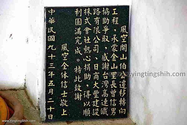 風空聚落裡道路狹窄,會車不易,還好此時僅我門一台車子漫遊在鄉間小路,非常悠哉無會車之虞。 但是還是建議來到此地,最好以步行或以單車方式漫遊最能感受風空之美。初次來訪,道路不熟,就開車逛逛,反正不趕時間,迷路就讓她迷路吧。逛了差不多時就問當地人,最後終於來到位於金山里六鄰風空地區的小山丘上,緊鄰高鐵旁有一棵老樹開山伯公老樟樹。此樹樹齡約三百年,樹高二十五公尺,胸徑一•四公尺,是新竹市最高齡的老樹,樹下有座雕琢樸實的伯公廟,伯公對聯陳述:「正直降百福,神靈集千祥」。