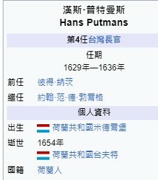1629〜1636年普特曼斯就任東印度公司第4任臺灣長官並主管中國沿海事務,於此期間的1633年並兼任東印度公司議會議員。