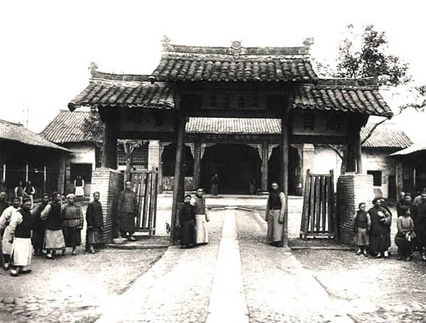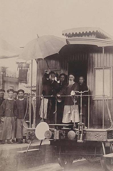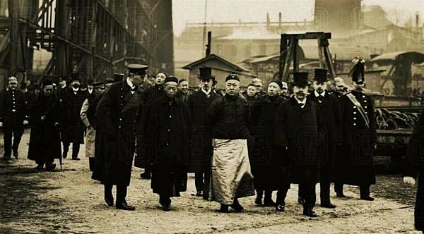 鏡頭中的載洵,身著黑色朝服,戴著幅寬檐官帽,正背著手站在船廠工人們中間。